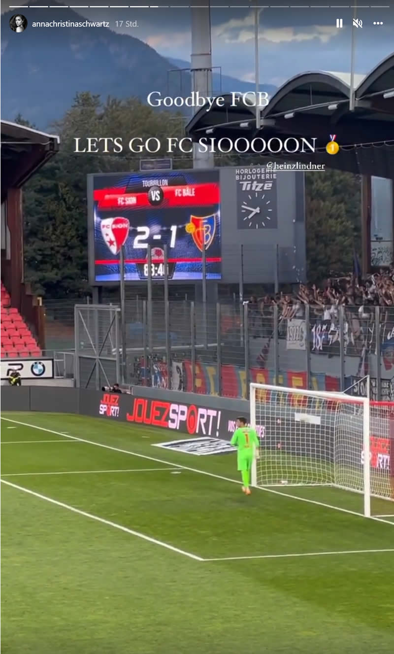 Schwartz wurde vor dem Spiel von «blue» interviewt. Da prognostizierte sie einen 3:0-Sieg für die Walliser. Mit dem Resultat lag sie zwar daneben, doch Lindner und Co. sicherten sich den Heimsieg. Angesichts des «Rauswurfs» des Österreichers bei den Bebbi in diesem Sommer (er wurde durch Marwin Hitz abgelöst) waren natürlich einige Emotionen im Spiel. In ihrer Instagram-Story schreibt Schwartz «Goodbye FCB» – ein kleiner Seitenhieb in Richtung der Basler. Schwartz hatte auf der Tribüne am Sieg der Sittener wohl mindestens so viel Freude wie ihr Gatte auf dem Rasen.